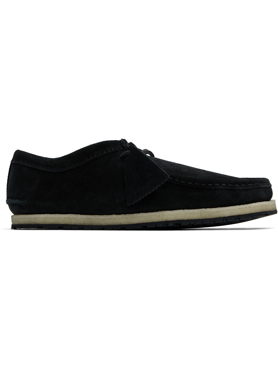 Lightweight suede derbys in black. · Square moc toe · Logo tags at lace-up closure · Bellows tongue · Suede and buffed leather lining · FSC-certified crepe-rubber midsole · Treaded rubber sole · Includes additional laces in black Supplier color: Black suede Upper: leather. Sole: rubber. Made in Viet Nam 251094M225023