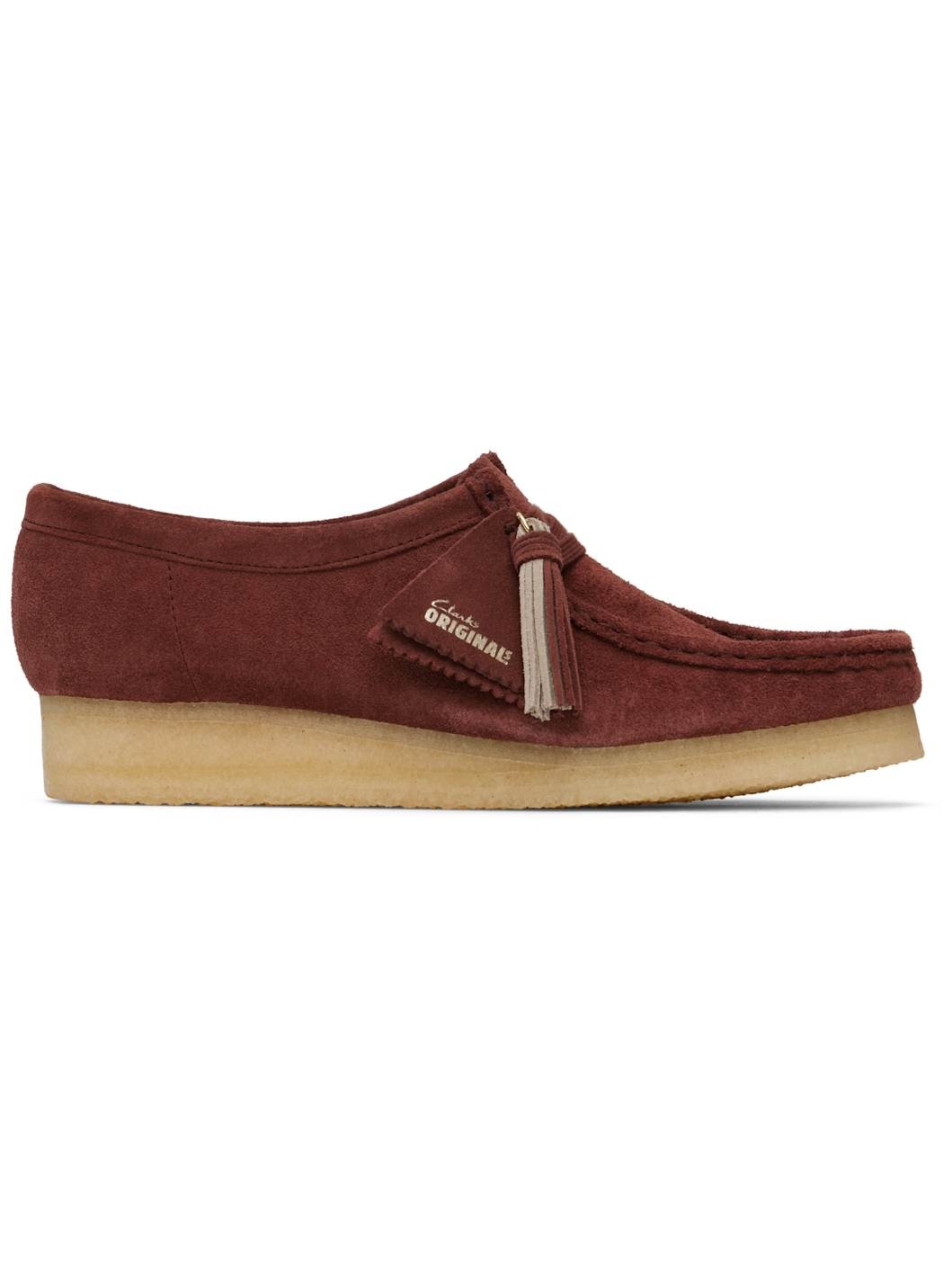 Suede derbys in burgundy. · Square moc toe · Logo tags and tassel at lace-up closure · Bellows tongue · Suede and grained leather lining · EVA rubber midsole · FSC-certified crepe rubber sole · Includes additional laces in red Supplier color: Deep red suede Upper: leather. Sole: rubber. Made in Viet Nam 242094F120005
