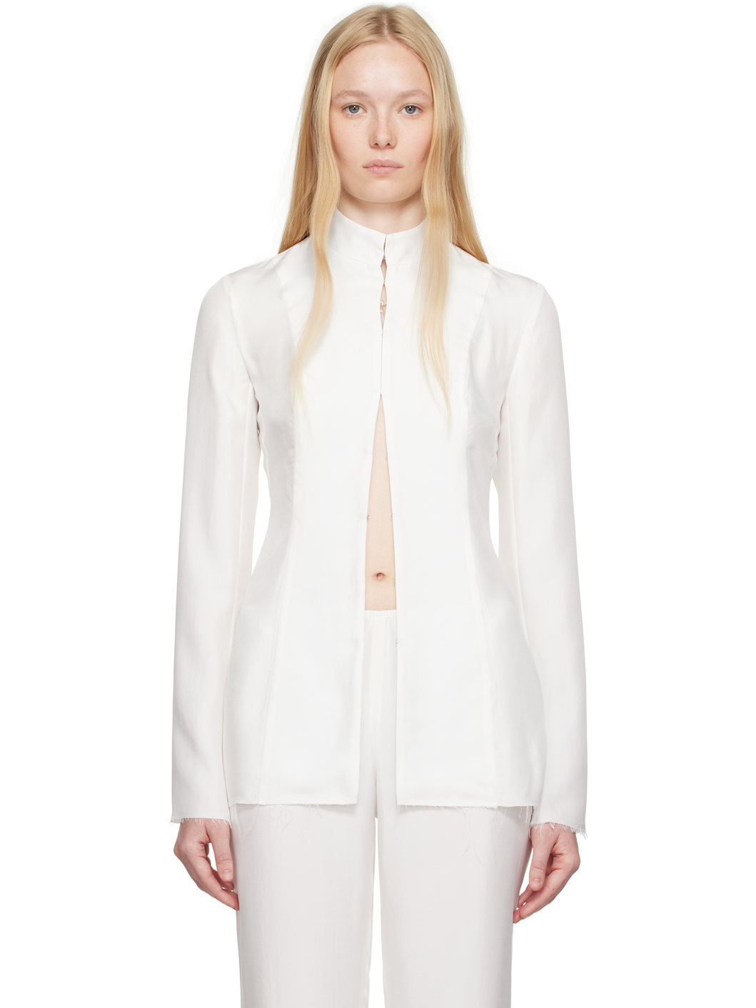 Silk twill blouse. · Stand collar · Hook-eye closure · Raw edge at hem and cuffs Supplier color: Natural white 100% silk. Made in United States 251275F107001