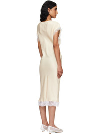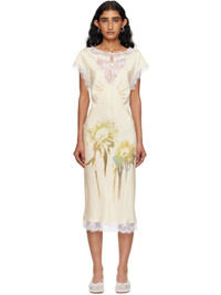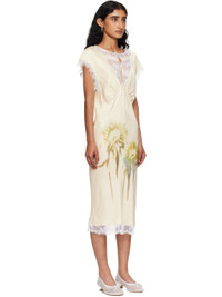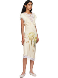 Bias-cut silk satin midi dress. · Floral lace trim with raw edges throughout · Boatneck · Gathering at chest · Floral graphic printed at front · Cap sleeves Supplier color: Butter faded flower Body 1: 100% silk. Body 2: 49% recycled nylon, 51% nylon. Made in United States 252236F054000