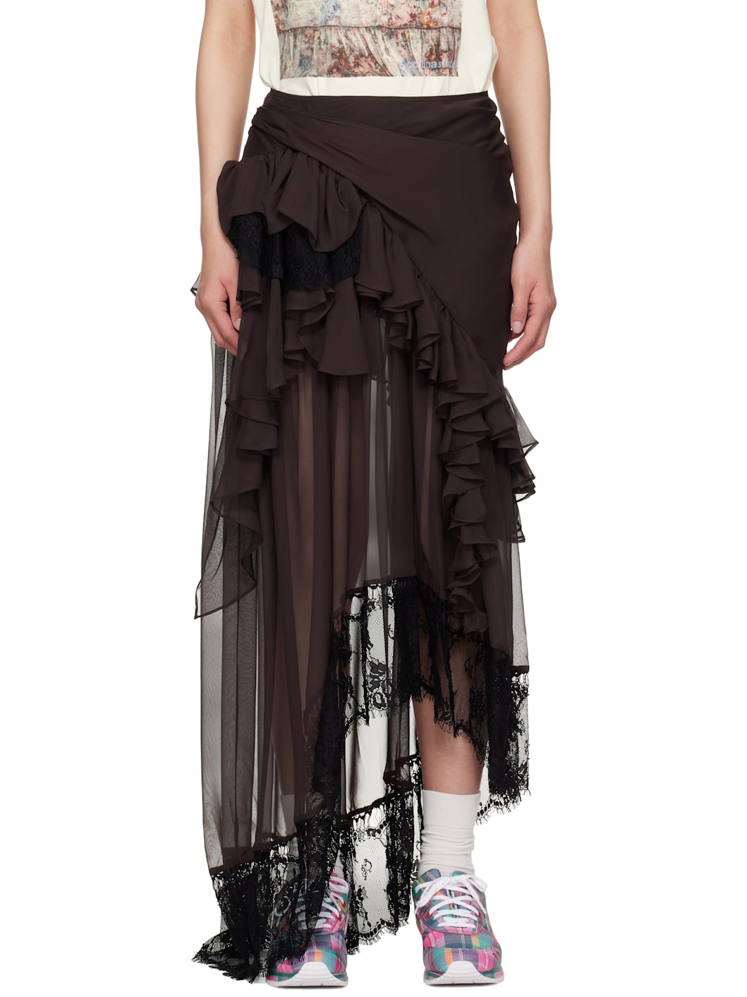 Sheer silk crepe maxi skirt. Ruffles and embroidered lace trim throughout. · Tiered asymmetrical construction · Zip closure at side seam Supplier color: Earth Body: 100% silk. Trim: 51% recycled nylon, 49% nylon. Made in United States 252236F093001