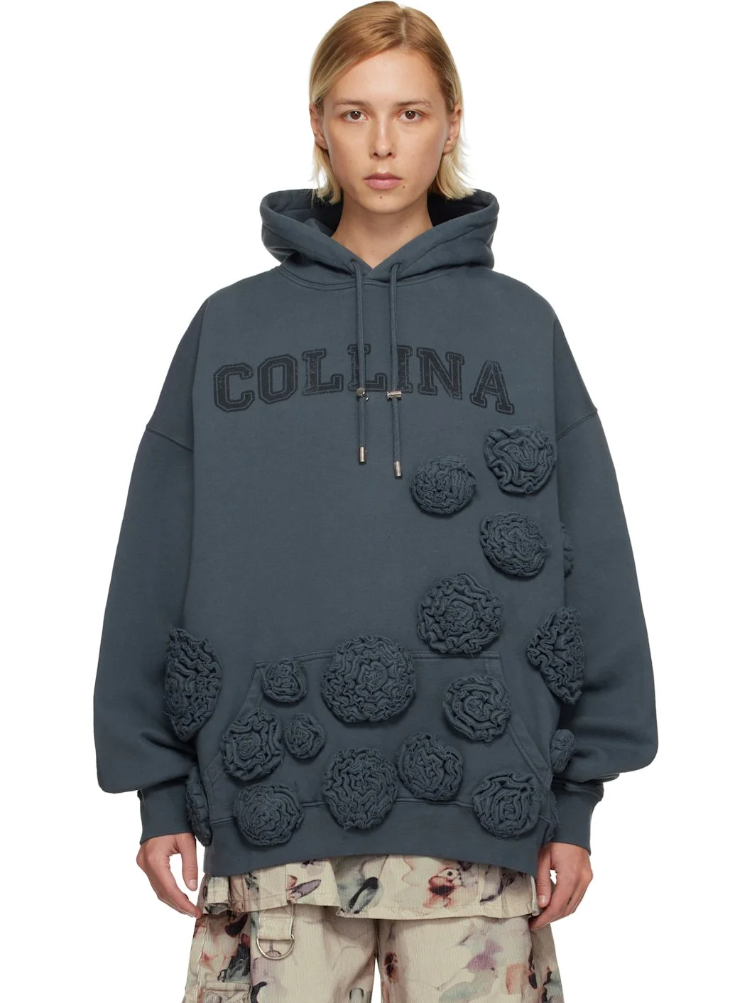 Hand-dyed deadstock cotton fleece hoodie. · Floral appliques with raw edges throughout · Drawstring at hood · Logo printed at chest · Kangaroo pocket at front · Rib-knit hem and cuffs · Dropped shoulders Supplier color: Charcoal 100% deadstock cotton. Made in Portugal 252236F097003