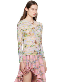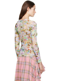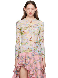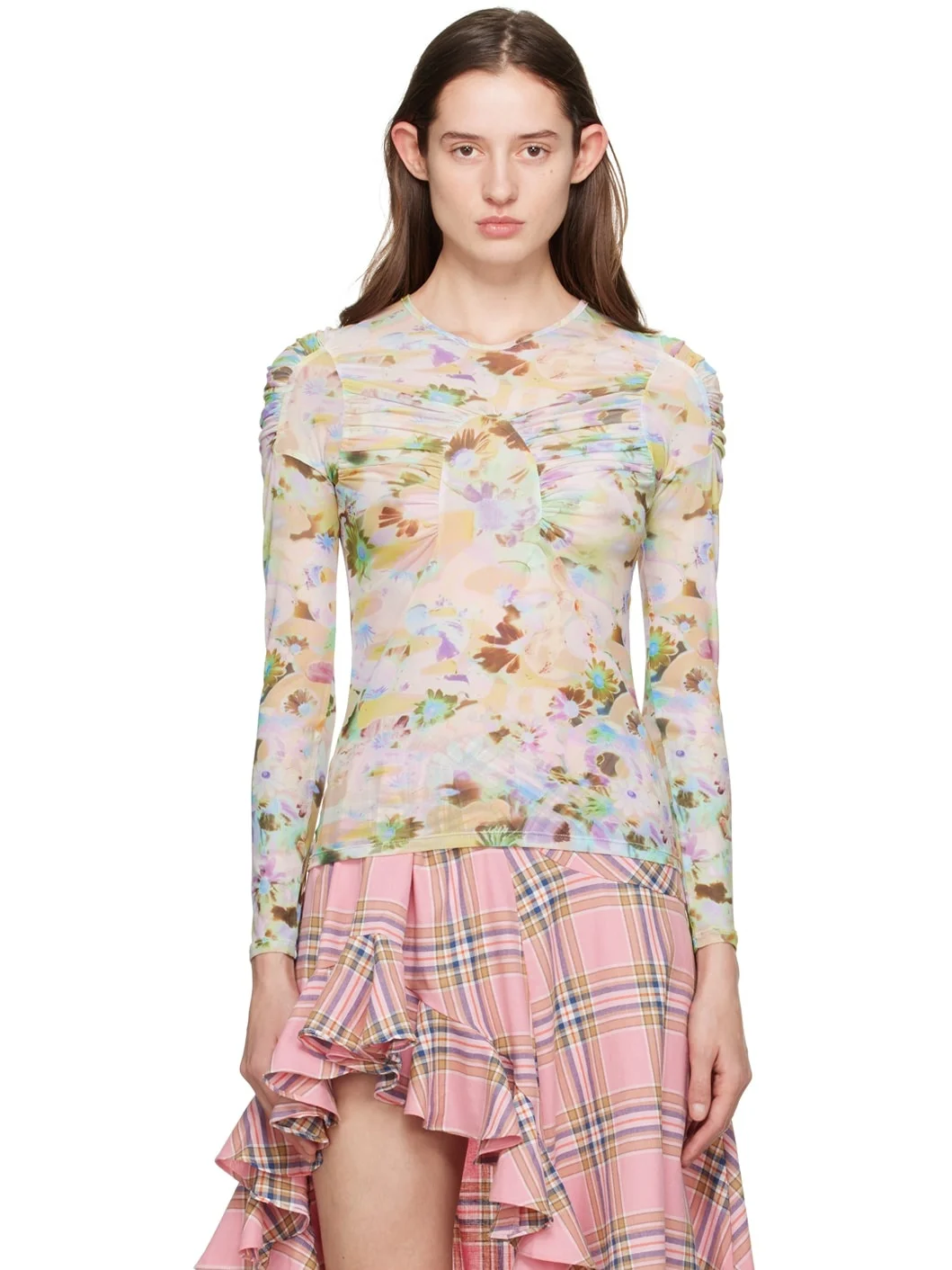 Semi-sheer paneled stretch polyester mesh T-shirt. Floral pattern printed throughout. · Crewneck · Ruching at front and shoulders Supplier color: Flower puzzle