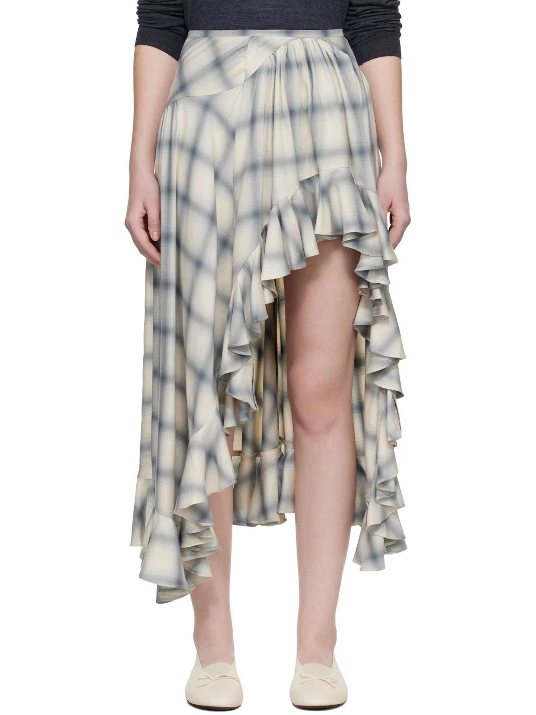 Sateen skirt. · Check pattern and gathering throughout · Asymmetrical construction · Concealed zip closure at side seam · Ruffles at droptail hem Supplier color: Cloudy Plaid 100% rayon. Made in United States 261236F092001