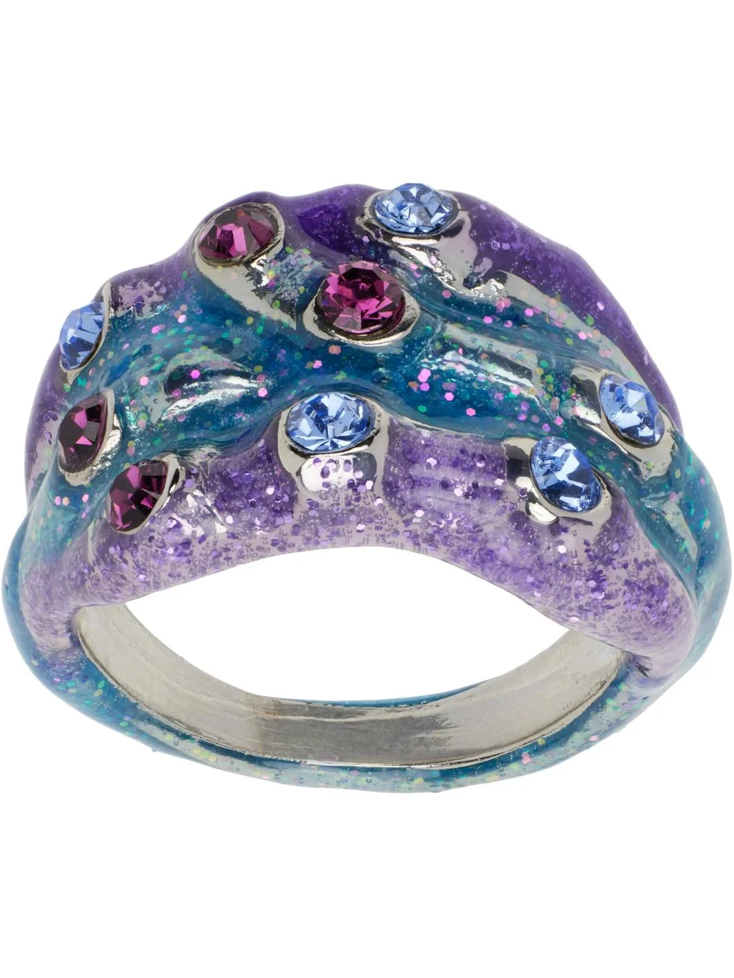 Hand-enameled tiered recycled pewter ring in blue and purple. Deadstock Swarovski crystals at face. Supplier color: Periwinkle glitter Recycled pewter, enamel, crystal. Made in United States 252236F024003