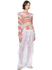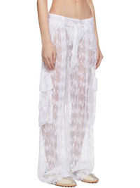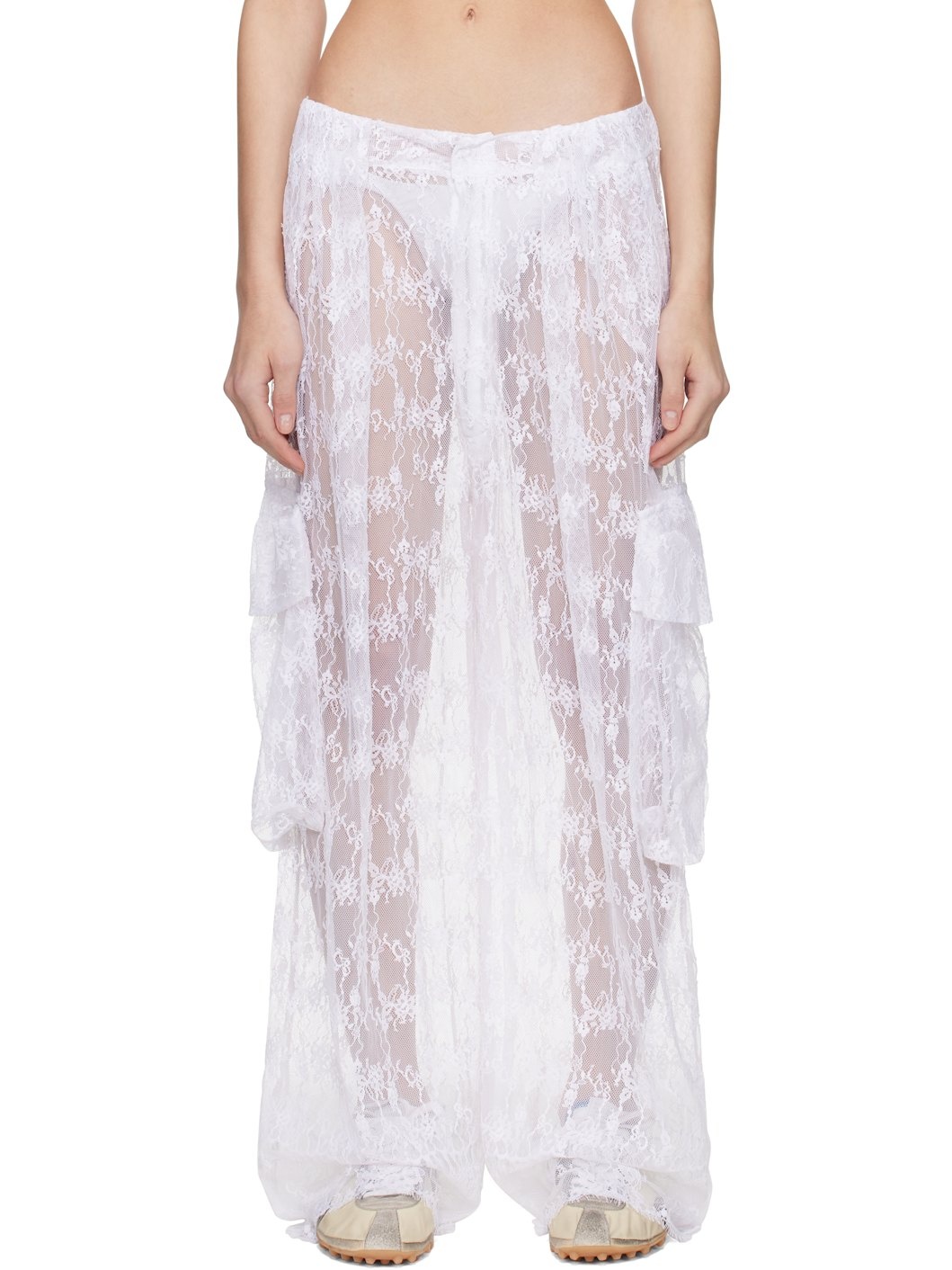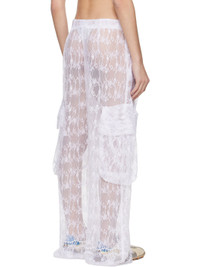Sheer deadstock nylon- and recycled nylon-blend lace cargo pants. Floral pattern embroidered throughout. · Mid-rise · Belt loops · Zip fly · Pleats at front · Fringed detailing at cuffs · Cargo pocket at outseams Supplier color: White 51% nylon, 49% recycled nylon. Made in United States 251236F087006