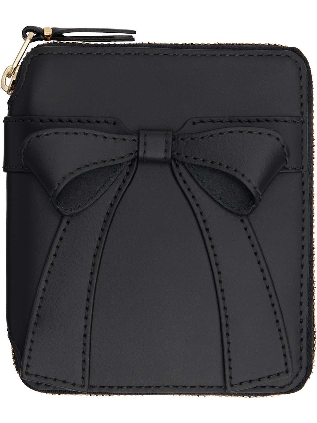 Buffed leather wallet in black. · Bow accent at face · Zip closure · Four card slots at interior · One patch pocket · One note slot · Press-stud coin compartment · Grained leather lining · H4.75" x W4.25" x D1" Supplier color: Black Leather. Made in Spain 252230F040012