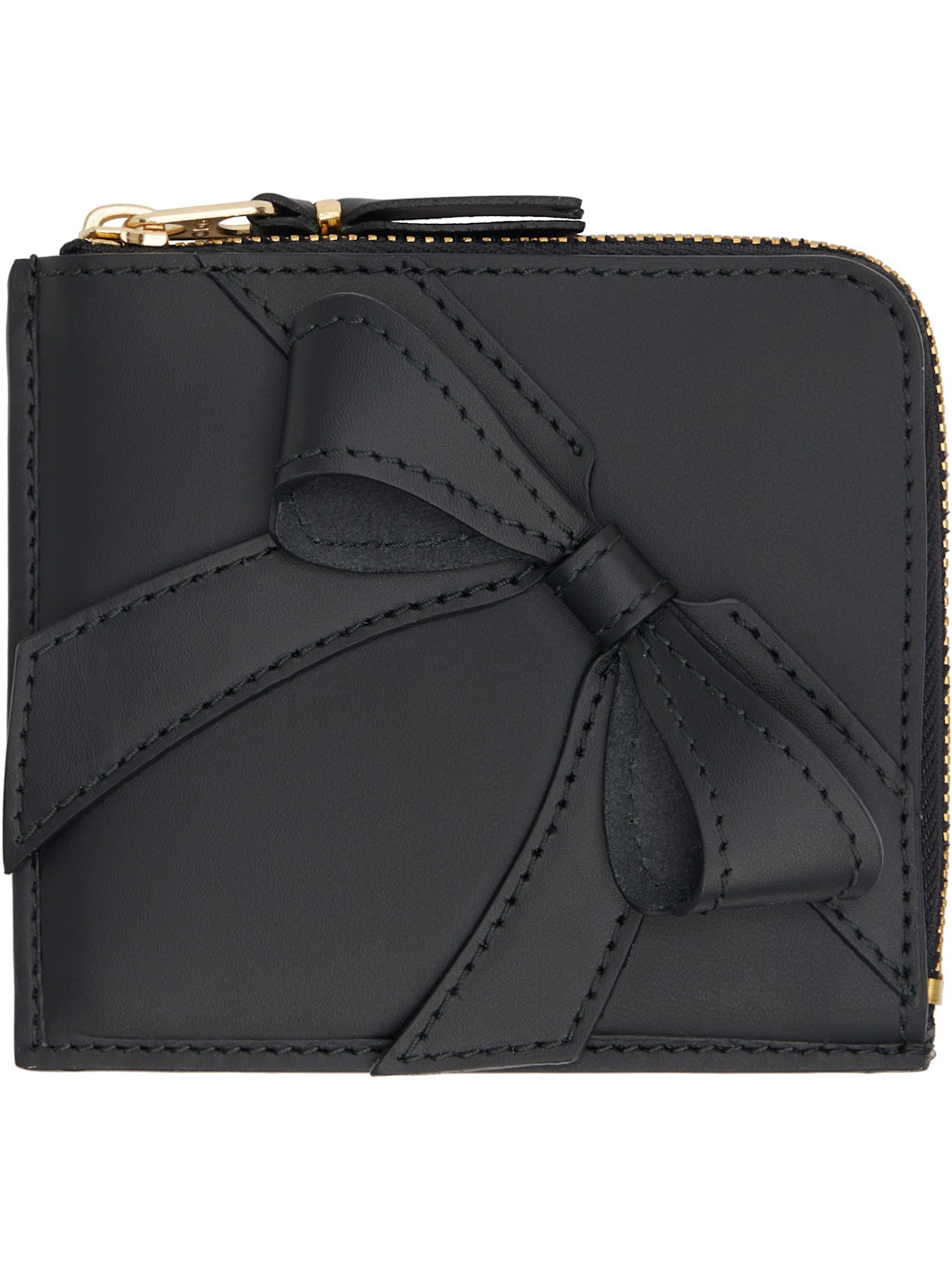 Buffed leather wallet in black. · Bow accent at face · Zip closure · Central note slot at interior · Buffed leather lining · H4" x W4.5" Supplier color: Black Leather. Made in Spain 252230F040010