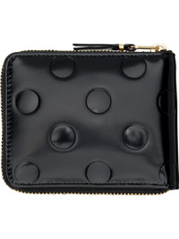 Polished leather bifold wallet. · Polka-dot pattern embossed throughout · Zip closure · Three card slots at interior · Two patch pockets and one note slot · One coin compartment · Unlined · H3.5" x W4.25" x D1" Supplier color: Black Leather. Made in Spain 252230M164017