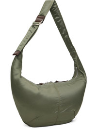 Satin messenger bag. · Leather trim throughout · Adjustable crossbody strap · Logo flag at side · Two-way zip closure · Patch pocket at interior · Camo-patterned lining · H11" x W19" x D4" Supplier color: Khaki Textile. Made in Japan 252057M170004