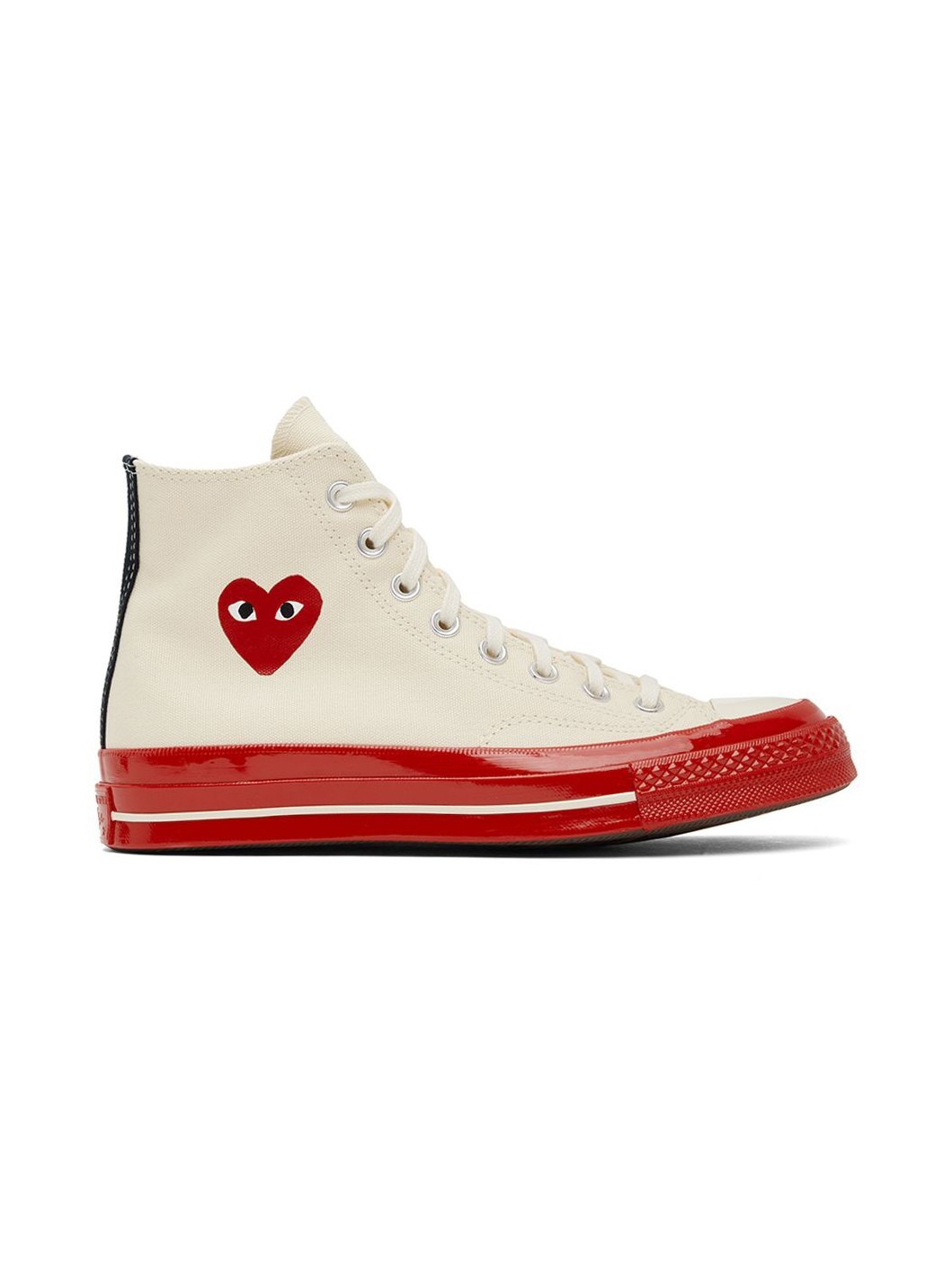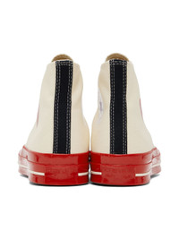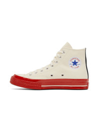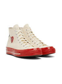 High-top canvas sneakers in off-white. · Round rubber cap toe · Lace-up closure · Logo graphic printed at outer side · Logo bonded and eyelet vents at inner side · Webbing trim and embossed logo at heel · Treaded rubber sole Part of the Comme des Garcons Play x Converse collaboration. Supplier color: Off-white Upper: textile. Sole: rubber. Made in Viet Nam 222246F127004