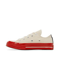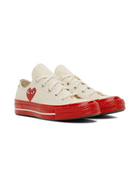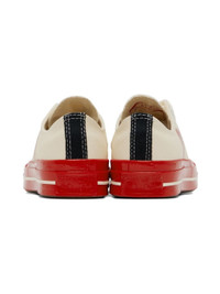 Low-top canvas sneakers in off-white. Logo graphic printed at outer side. · Round rubber cap toe · Lace-up closure · Webbing trim in black at heel · Ortholite® footbed · Rubber midsole in red with logo embossed at heel · Treaded rubber outsole in brown Part of the Comme des Garçons Play x Converse collaboration. Supplier color: Off white Upper: textile. Sole: rubber.