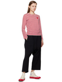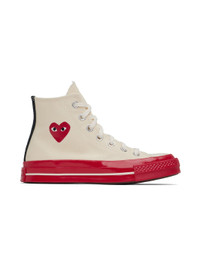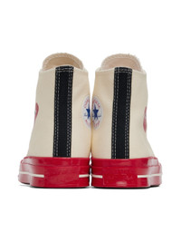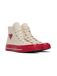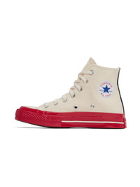 High-top canvas sneakers in off-white and red. · Round rubber cap toe · Lace-up closure · Webbing trim at heel counter · Logo graphic printed at outer side · Logo bonded at inner side · Eyelet vents at inner side · Logo embossed at heel · Textured rubber midsole · Treaded rubber outsole Part of the Comme des Garcons Play x Converse collaboration. Supplier color: Off-white Upper: textile. Sole: rubber. Made in Viet Nam 231246F127001