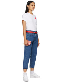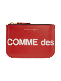 Buffed leather pouch in red. Gold-tone logo stamp at face. Logo printed in white at front and back face. Zip closure. Leather lining in black. Gold-tone hardware. Approx. 5.75" length x 4" height. Supplier color: Red Leather. Made in Spain 211230F045009