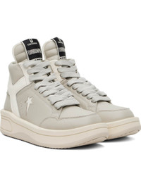 High-top grained leather sneakers in off-white. · Perforated detailing throughout · Lace-up closure · Logo patch at padded tongue · Padded collar · Logo cutout at sides · Buffed faux-leather lining · Treaded rubber platform sole · Platform: H2" Part of the Rick Owens DRKSHDW x Converse collaboration. Supplier color: Oyster/White Upper: leather. Sole: rubber. Made in China 251126M236000