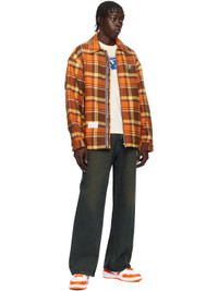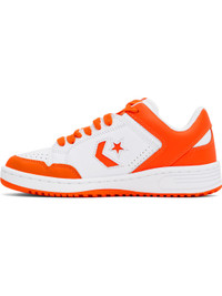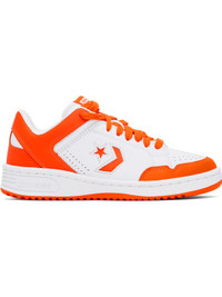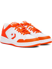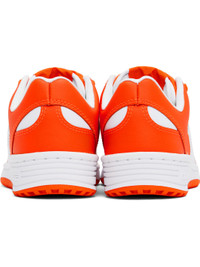 Low-top grained leather sneakers in white and orange. · Perforations at toe and sides · Lace-up closure · Logo patch at padded tongue · Padded collar · Inset logo graphic at sides · Cushioned CX foam insole · Mesh lining · Logo embossed at midsole · Treaded rubber sole Supplier color: White/Orange/White Upper: leather. Sole: rubber. Made in Viet Nam 251799M237039