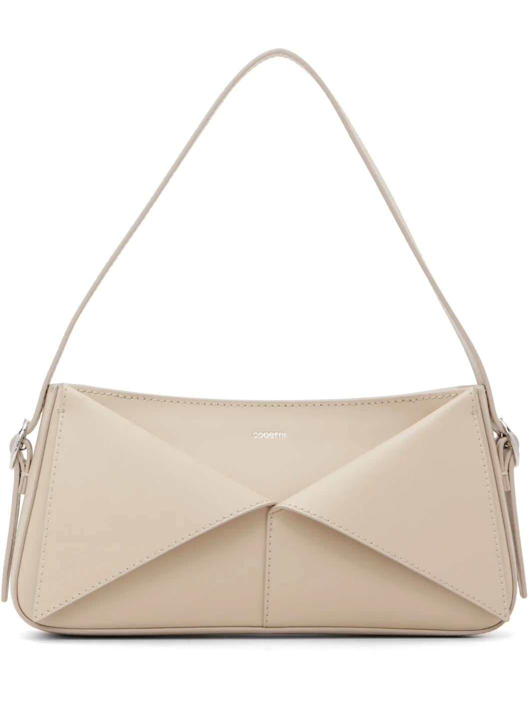 Buffed leather shoulder bag. · Adjustable and detachable shoulder strap · Logo stamp, foldover panels, and patch pockets at face · Zip closure · Twill lining · H5" x W10" x D1.75" Supplier color: Beige Leather. Made in Italy 261325F048021