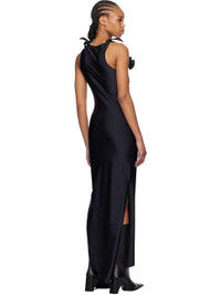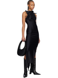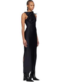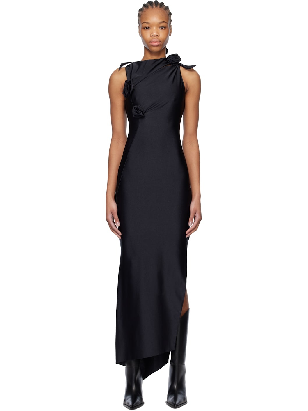Stretch nylon jersey maxi dress. · Asymmetric construction · Boatneck · Cutout at chest · Floral appliques at front · Slit at side seams · Knotted detailing at shoulder Supplier color: Black 80% polyamide, 20% elastane. Made in France 251325F055002