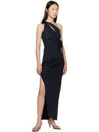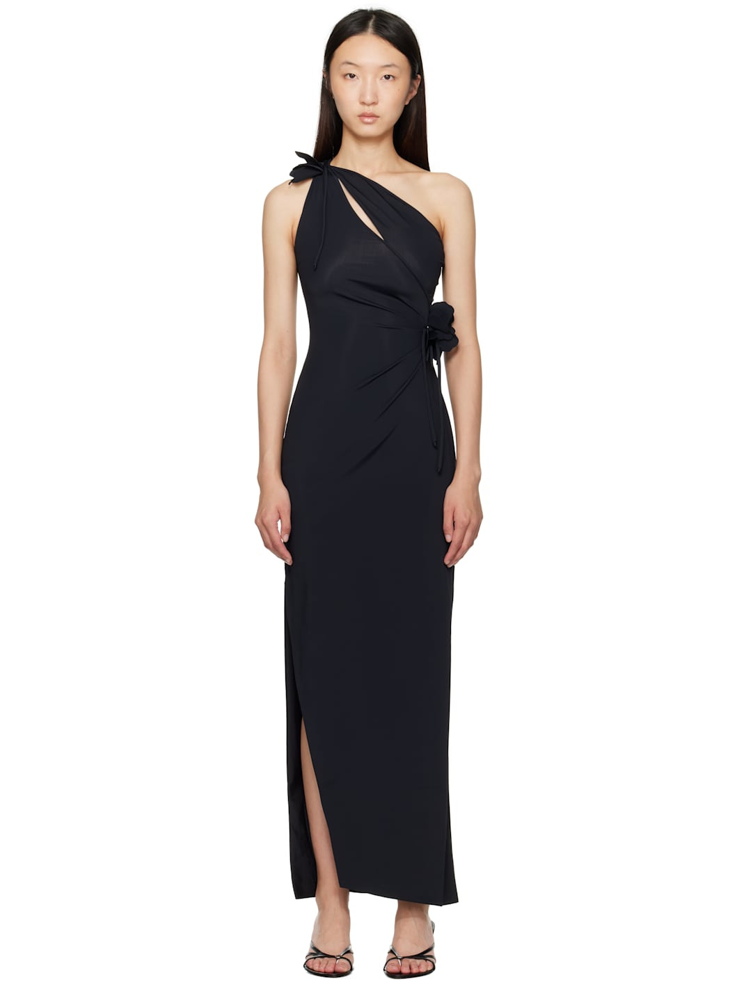 Stretch nylon jersey maxi dress. · Single-shoulder construction · Asymmetrical neck and hem · Cutout at chest · Gathering at waist · Floral applique at waist and shoulder · Slit at side seam Supplier color: Black 78% polyamide, 22% elastane. Made in France 252325F054003