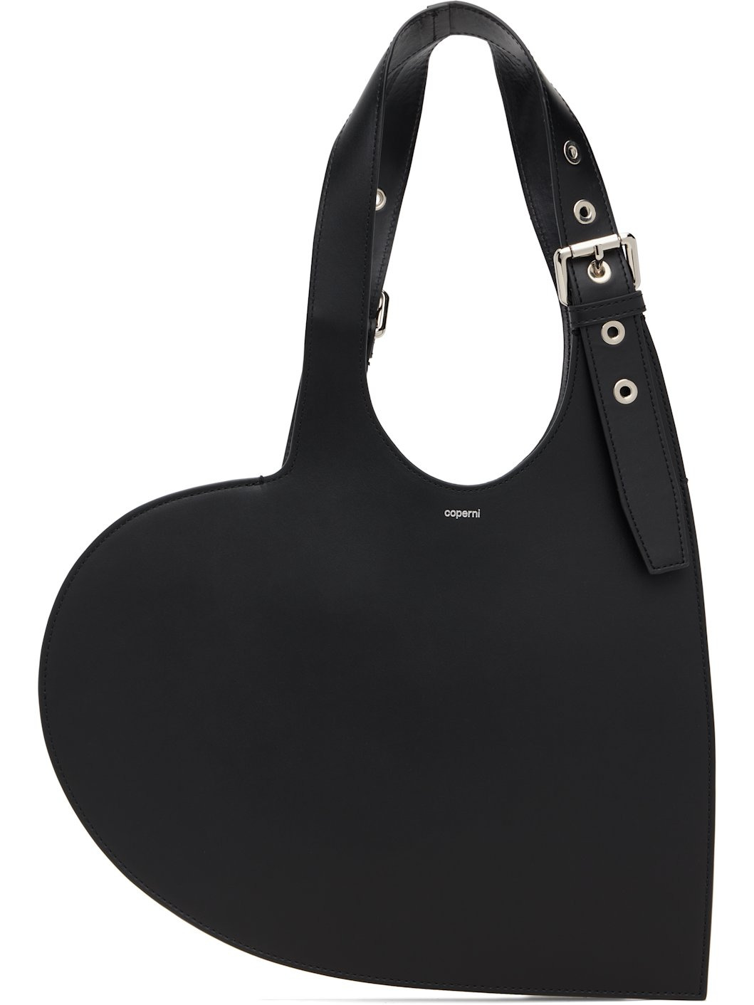 Heart-shaped buffed calfskin tote. · Adjustable pin-buckle carry handles · Logo stamp at face · Buffed leather lining · H9.75" x W13" · Total height: H19" Supplier color: Black Calfskin. Made in Italy 252325F049003