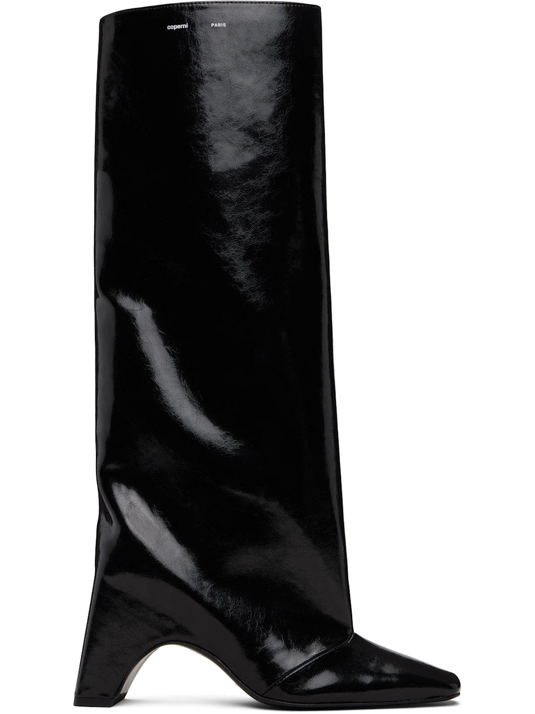 Knee-high crackled patent faux-leather boots. · Square toe · Logo printed at collar · Elasticized gusset at inner side · Buffed leather lining · Covered block heel with rubber injection · Leather sole · Heel: H3.5" Supplier color: Black Upper: synthetic. Sole: leather, rubber. Made in Italy 252325F115004