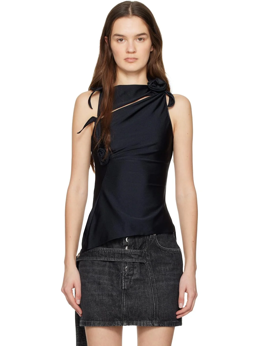 Stretch nylon jersey top. · Boatneck · Knots and floral appliques at front and shoulder · Cutout at front · Asymmetrical hem · Vented side seam Supplier color: Black 80% polyamide, 20% elastane. Made in France 261325F111000
