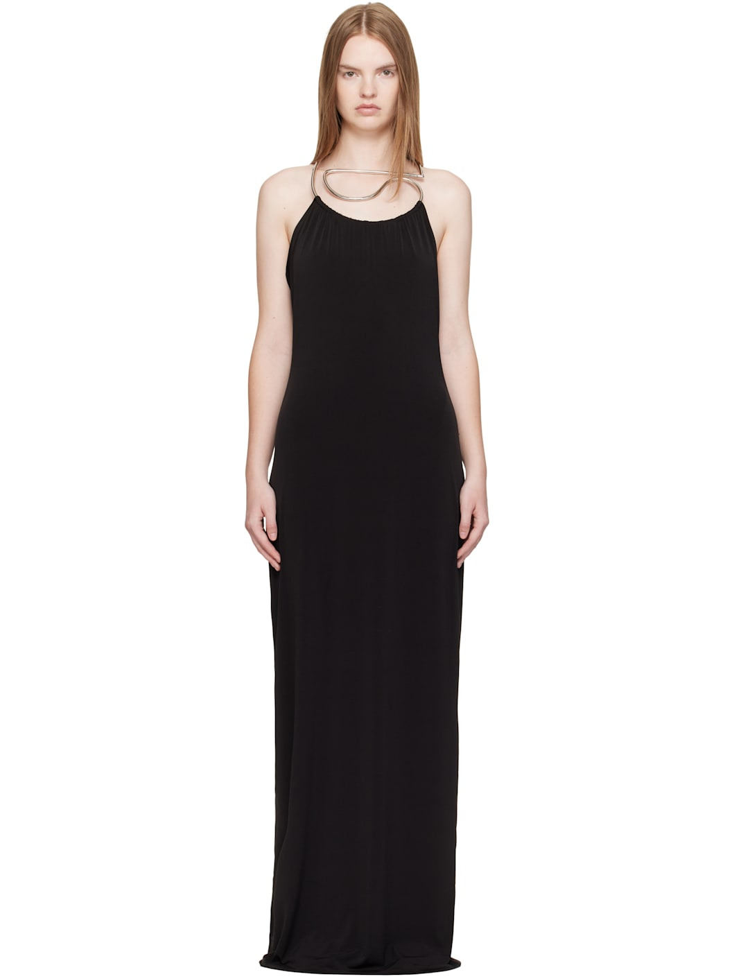 Stretch jersey maxi dress. · Hinged necklace-style logo hardware at collar · Low back Supplier color: Black 95% polyester, 5% elastane. Made in France 252325F055005