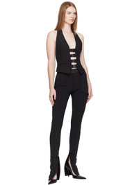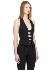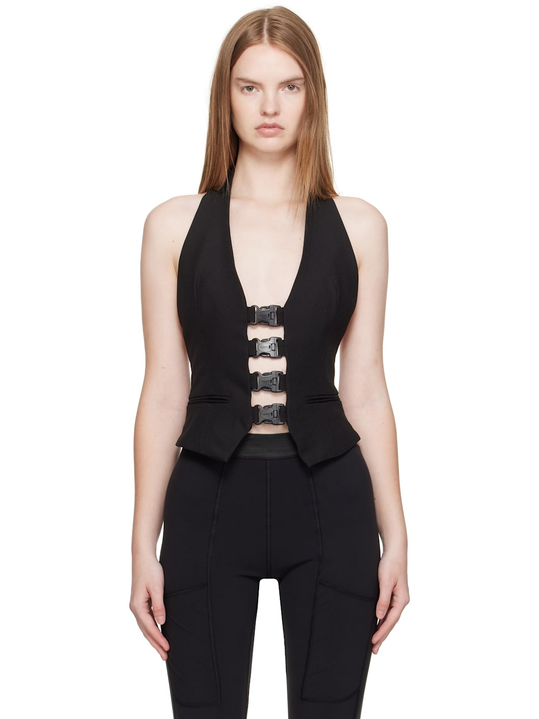 Recycled canvas waistcoat. · Plunging neck · Press-release fastenings at front · Darts at chest · Mock welt pockets · Fixed press-release strap at low back · Full satin lining Supplier color: Black Body: 100% recycled polyester. Lining: 52% acetate, 48% viscose. Made in Bulgaria 252325F111007