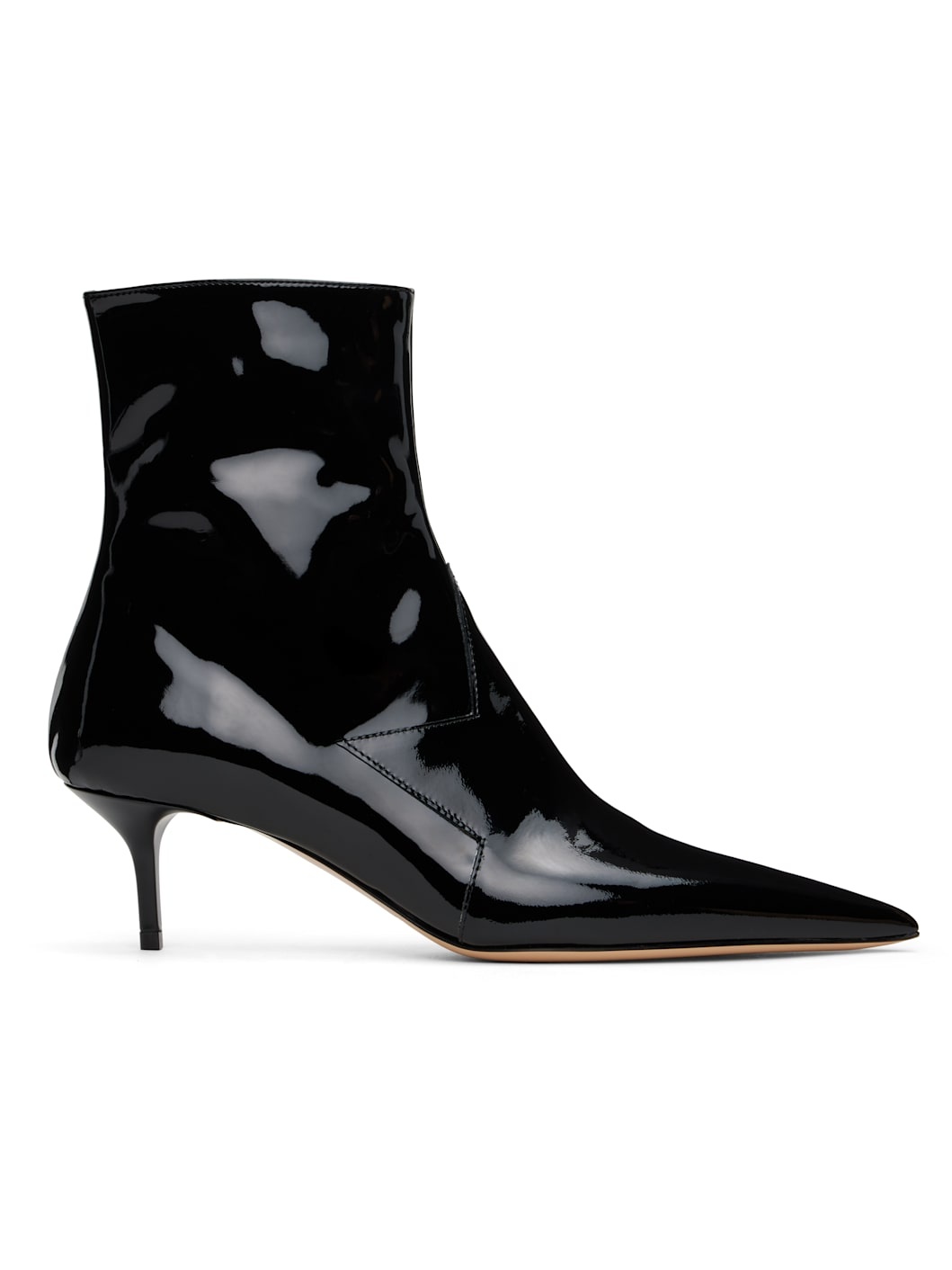 Ankle-high patent faux-leather boots in black. · Pointed toe · Zip closure at inner side · Buffed faux-leather lining · Lacquered stiletto heel with rubber injection · Faux-leather sole · Heel: H2.25" Supplier color: Black Upper: synthetic. Sole: synthetic, rubber. Made in Italy 242325F113002