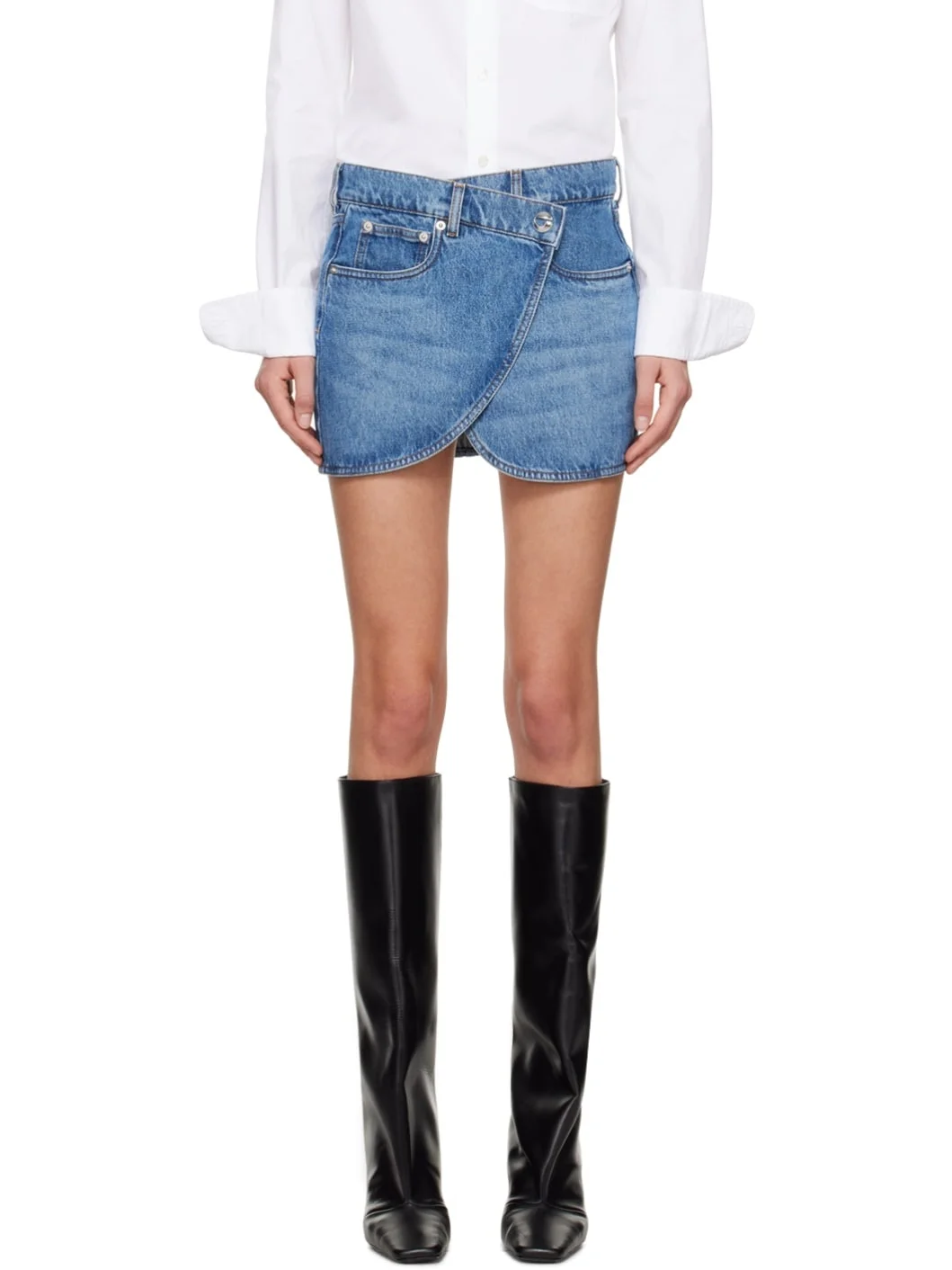 Non-stretch denim skirt. Fading and whiskering throughout. · Asymmetrical and wrap construction · Press-stud fastening at front · Five-pocket styling · Leather logo patch at back waistband · Logo-engraved silver-tone hardware · Contrast stitching in orange Supplier color: Washed blue 100% cotton. Made in Italy 241325F090007