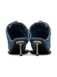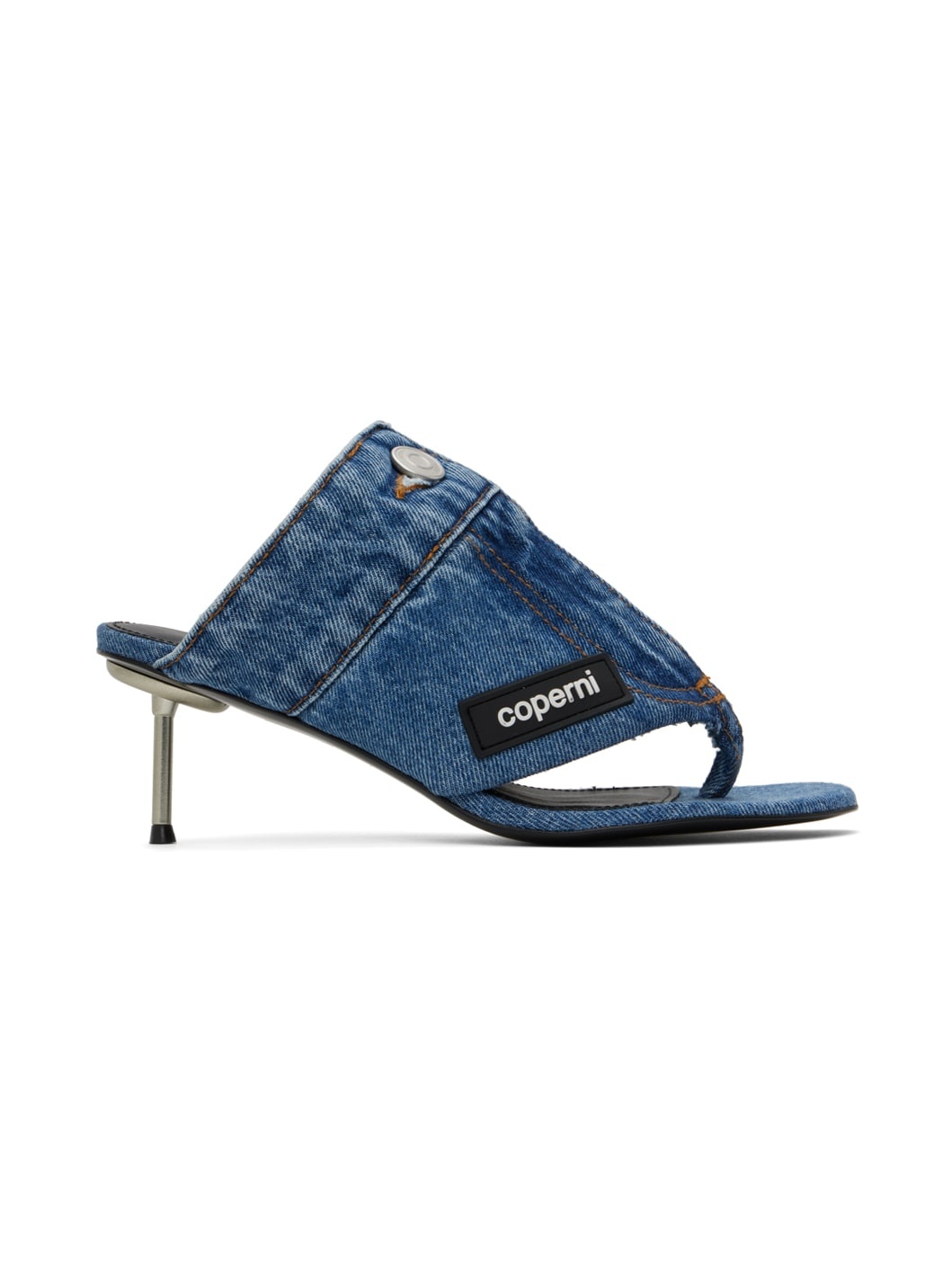 Denim heeled sandals in blue. · Thong-style strap at open toe · Zip-fly and button fastening at vamp · Rubberized logo patch at outer side · Logo stamp at leather footbed · Stiletto heel · Smooth leather sole · Logo-engraved silver-tone hardware · Contrast stitching in tan · Heel: H1.75" Supplier color: Washed blue Upper: textile. Sole: leather. Made in Spain 241325F125004