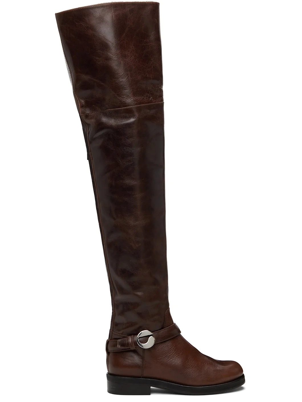 Over-the-knee crinkled grained calfskin boots. · Post-stud strap with logo hardware at vamp · Zip closure at inner side · Stacked leather block heel · Leather sole with rubber injections · Heel: H1.25" Supplier color: Brown Upper: calfskin. Sole: leather, rubber. Made in Spain 252325F115013