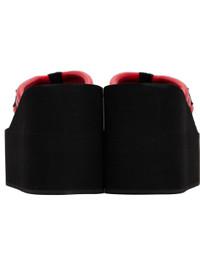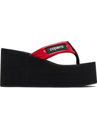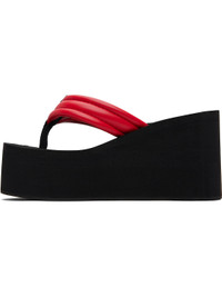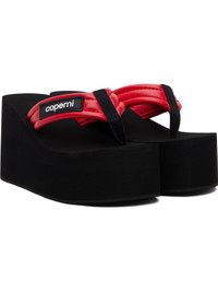 Buffed faux-leather heeled sandals. · Thong-style strap and logo patch at vamp · Foam rubber platform midsole · Crepe rubber sole · Platform: H2" · Heel: H3.75" Supplier color: Black/Red Upper: synthetic. Sole: rubber. Made in Spain 252325F125004