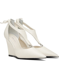 Snake-embossed calfskin heels. · Pointed toe · Logo hardware at vamp · Self-tie ankle strap · Buffed leather and suede lining · Covered wedge heel with rubber injection · Leather sole · Heel: H3.5" Supplier color: White Upper: calfskin. Sole: leather, rubber. Made in Spain 261325F122000