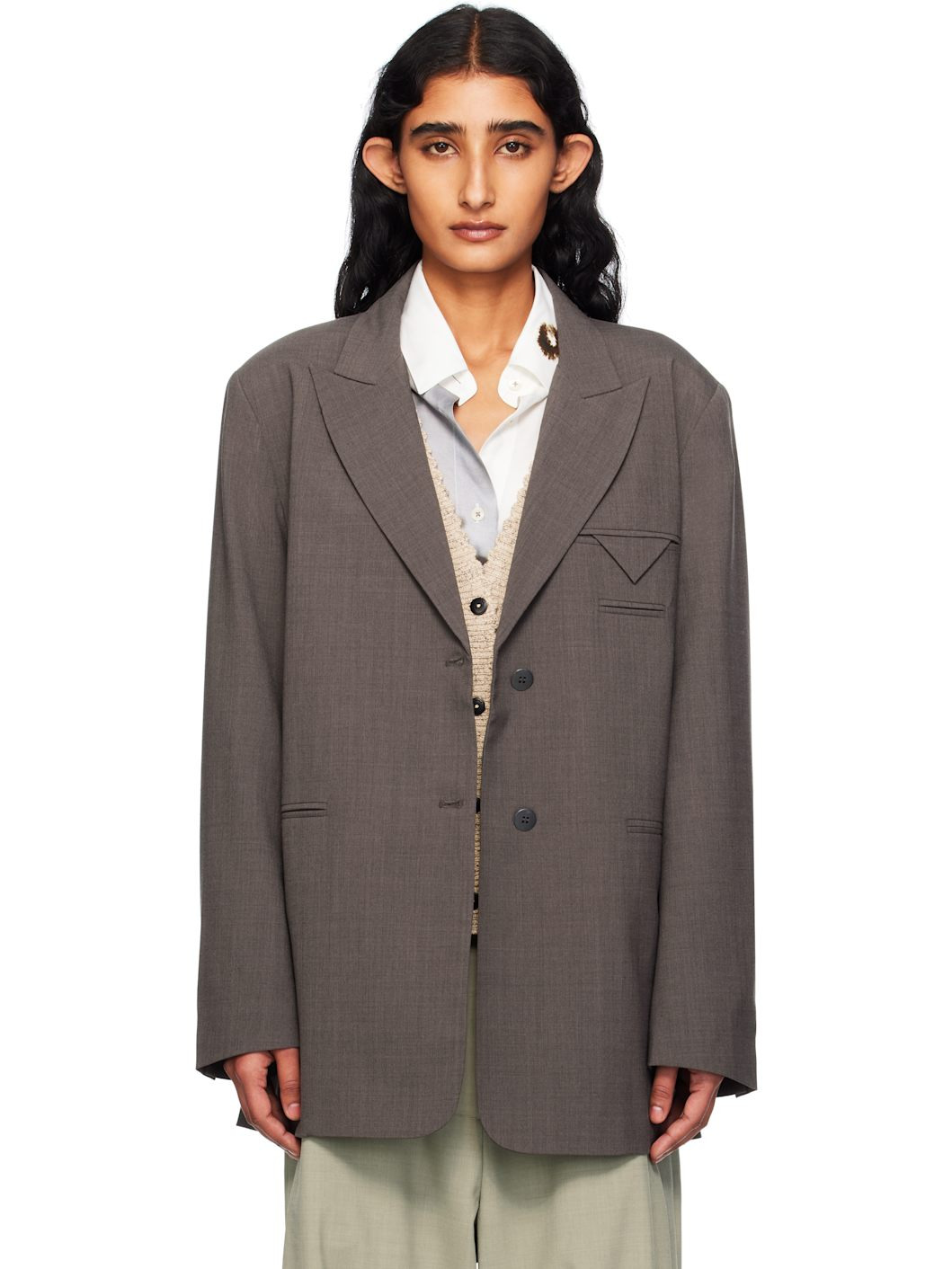Woven stretch wool-blend blazer. · Peaked lapel · Button closure · Welt pockets at chest and waist · Buttoned surgeon's cuffs · Vented back hem · Full viscose satin lining · Oxidized metal hardware Supplier color: Deep taupe Body: 55% polyester, 43% wool, 2% elastane. Lining: 100% viscose. Made in Spain 251909F057007