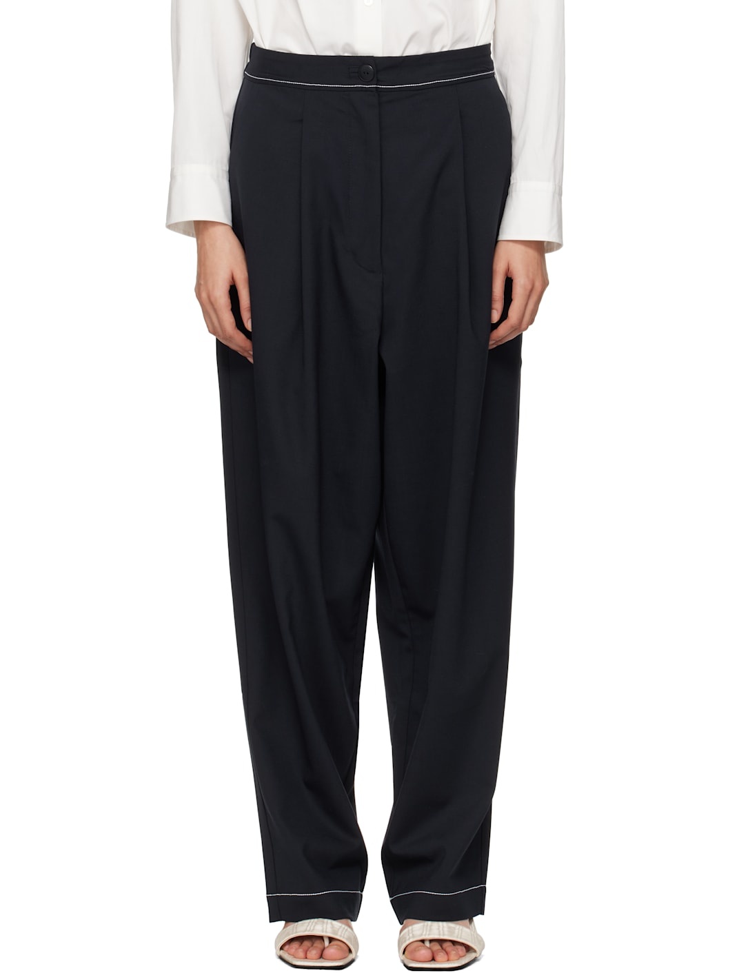 Wide- and straight-leg stretch recycled polyester- and wool-blend canvas trousers. · Partially elasticized waistband · Four-pocket styling · Zip-fly · Pleats at front · Contrast stitching in white Supplier color: Navy 54% recycled polyester, 44% wool, 2% elastane. Made in Spain 242909F087012