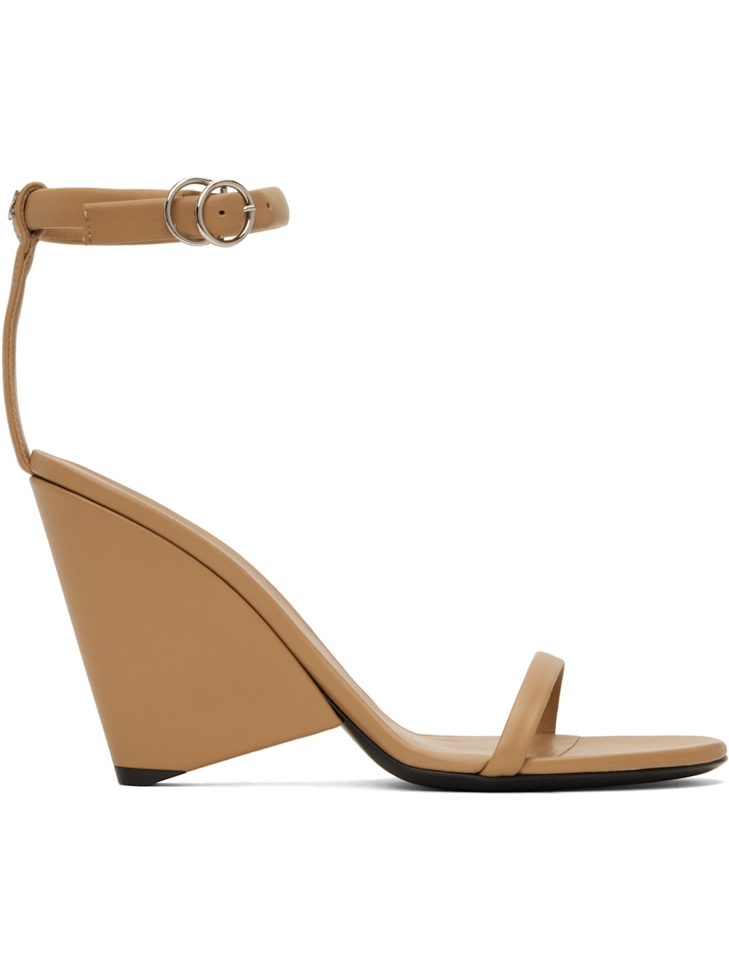 Buffed lambskin heeled sandals in beige. · Open toe · Stap at vamp · Pin-buckle ankle strap · Silver-tone logo hardware at heel tab · Logo-printed footbed · Covered wedge heel with rubber injection · Smooth leather sole · Heel: H3.5" Supplier color: Hazelnut Upper: lambskin. Sole: leather. Made in Italy 251783F125002