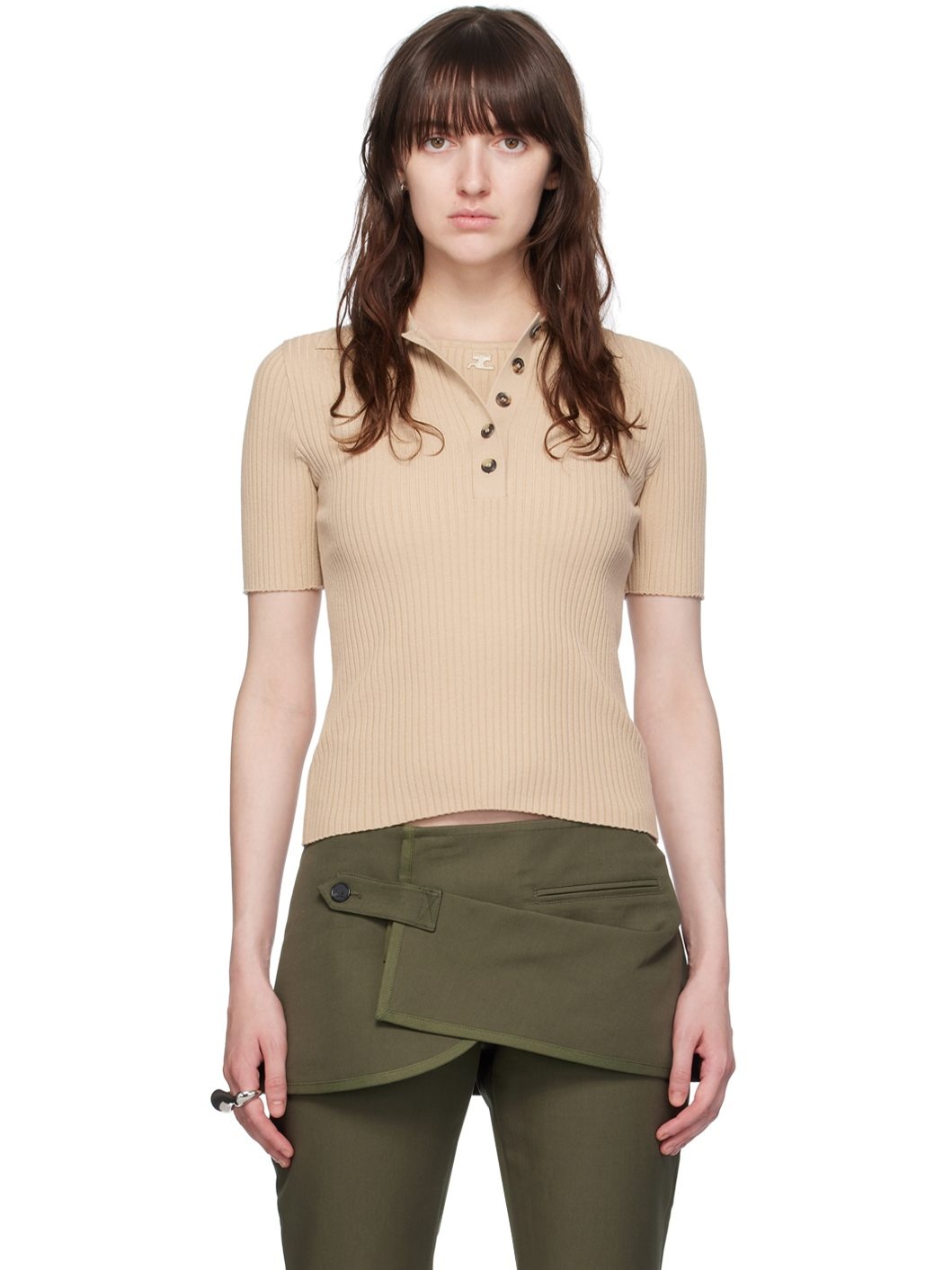 Rib knit viscose-blend polo. · Open spread collar · Five-button placket · Embroidered logo patch at chest · Logo-engraved hardware Supplier color: Cappuccino 70% viscose, 30% polyester. Made in Bulgaria 242783F108001