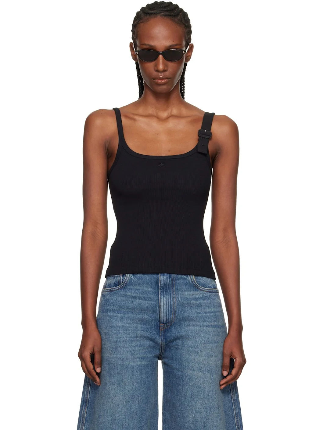 Stretch cotton ribbed jersey tank top. · Rib-knit scoop neck, armscyes, and spaghetti straps · Logo embroidered at chest · Pin-buckle at shoulder strap Supplier color: Black Body: 98% cotton, 2% elastane. Trim: 100% cotton. Made in Portugal 261783F111008