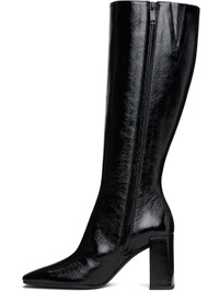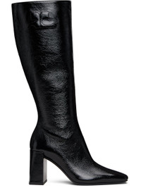Knee-high crinkled patent calfskin boots. · Square toe · Logo embroidered at outer side · Zip closure at inner side · Buffed leather lining · Covered block heel with rubber injection · Leather sole · Heel: H3.25" Supplier color: Black Upper: calfskin. Sole: leather, rubber. Made in Italy 252783F115001