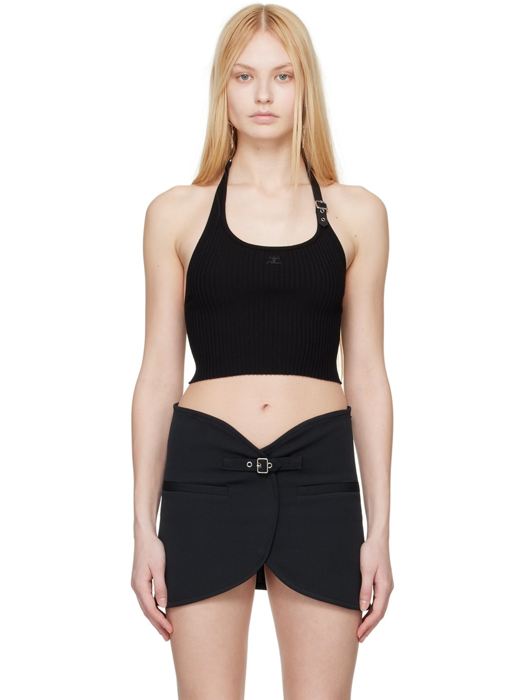 Rib knit viscose-blend tank top. · Scoop neck · Logo patch at front · Cropped hem · Detachable pin-buckle halter strap Supplier color: Black 70% viscose, 30% polyester. Made in Bulgaria 241783F111022