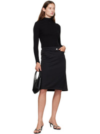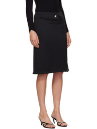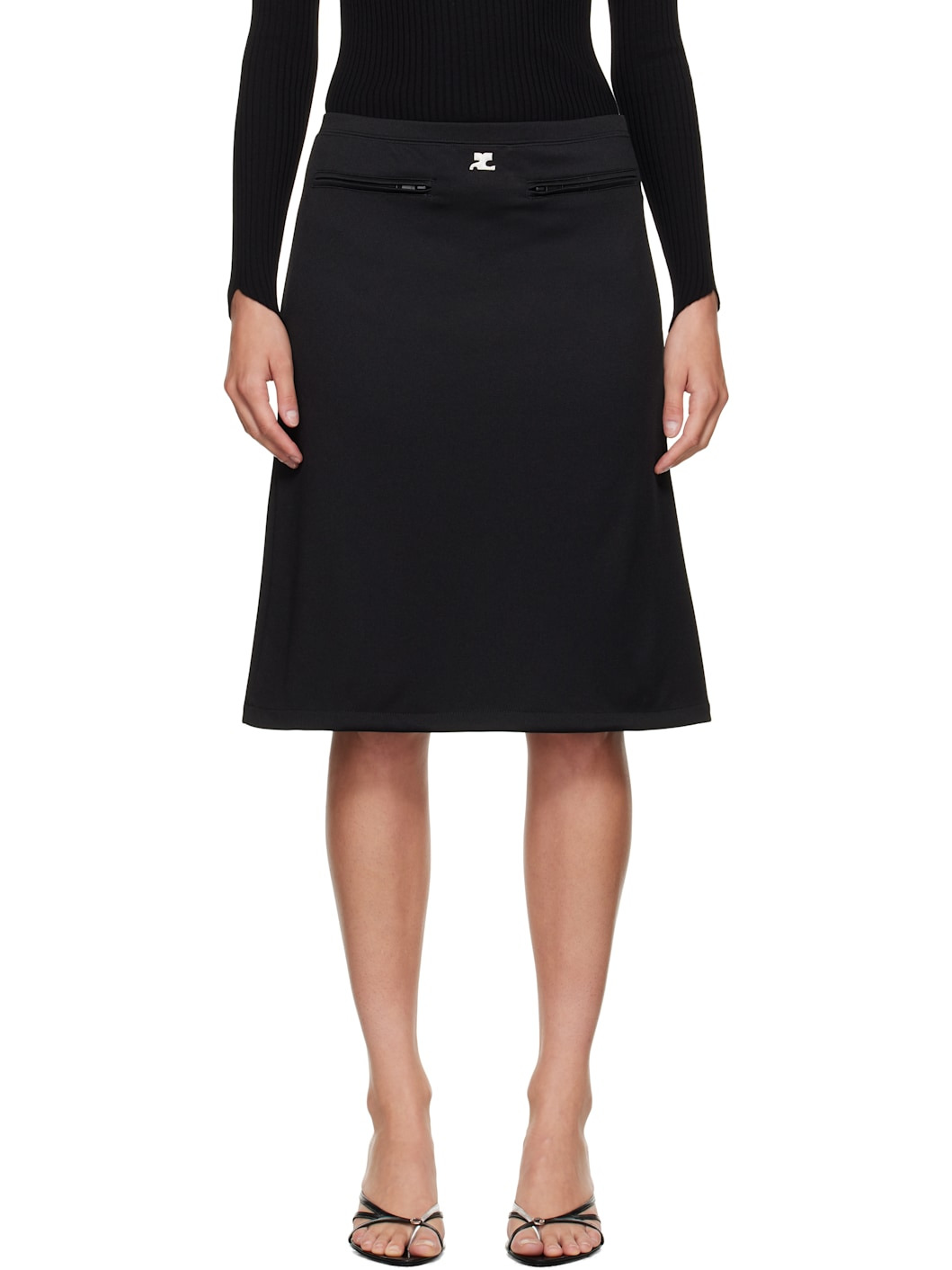Interlock jersey midi skirt. · Elasticized waistband · Embroidered logo patch at front waist · Two-pocket styling · Darts at back waist Supplier color: Black 100% polyester. Made in Tunisia 252783F092005