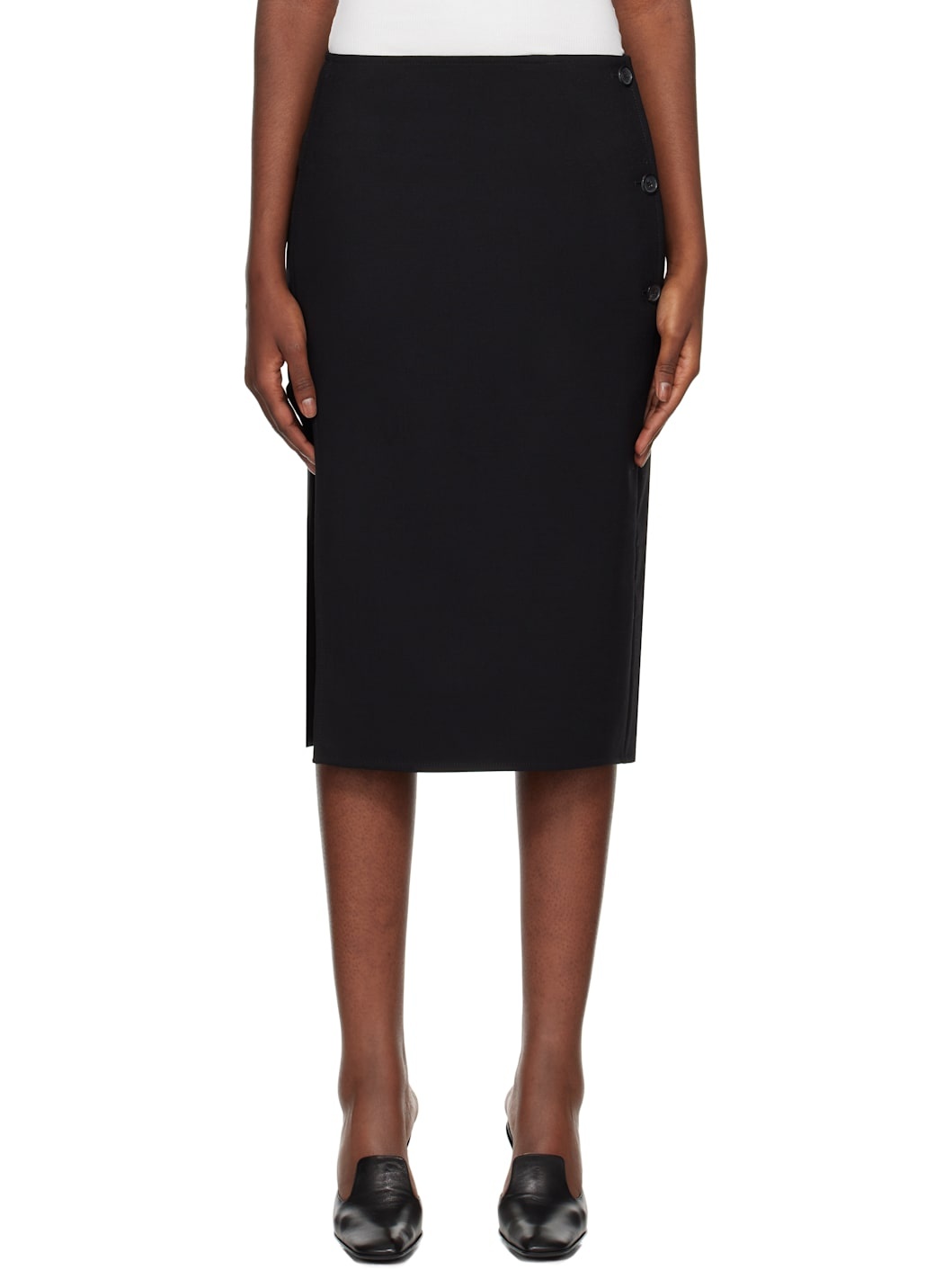 Stretch wool-blend delaine midi skirt. · Button closure at side seam · Slit at side seam · Embroidered logo patch at back waist Supplier color: Black 93% wool, 4% elastane, 3% polyamide. Made in Romania 242783F092004