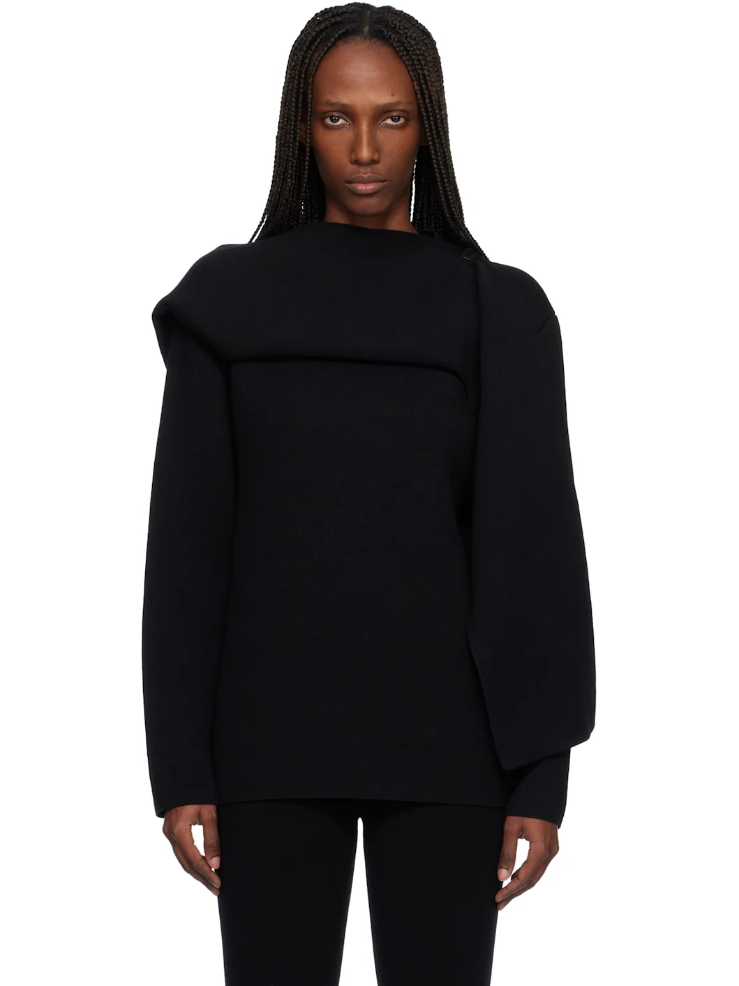 Oversized knit merino wool sweater. · Integrated scarf-style panel at collar · Rib-knit crewneck, hem, and cuffs · Logo embroidered at front · Button fastening at shoulder · Dropped shoulders Supplier color: Black 100% merino wool. Made in Portugal 252783F096006
