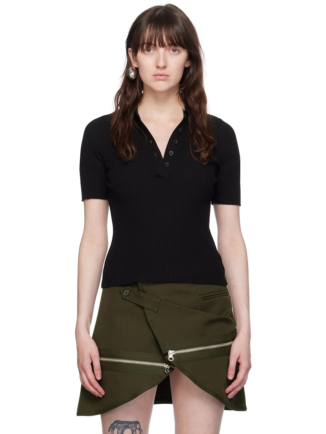 Rib knit viscose-blend polo. · Open spread collar · Five-button placket · Embroidered logo patch at chest · Logo-engraved hardware Supplier color: Black 70% viscose, 30% polyester. Made in Bulgaria 242783F108002