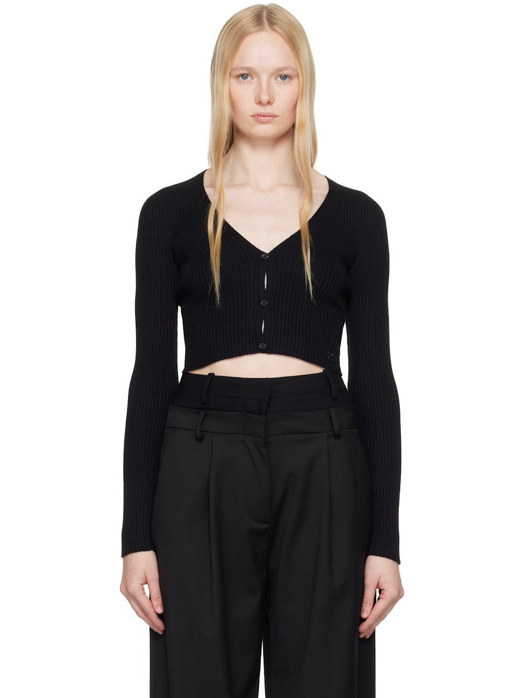 Rib-knit cotton- and merino wool-blend cardigan. · Y-neck · Button closure · Embroidered logo patch at front hem · Cropped hem · Lettuce edge at hem and cuffs Supplier color: Black 80% cotton, 20% merino wool. Made in Italy 251783F095003