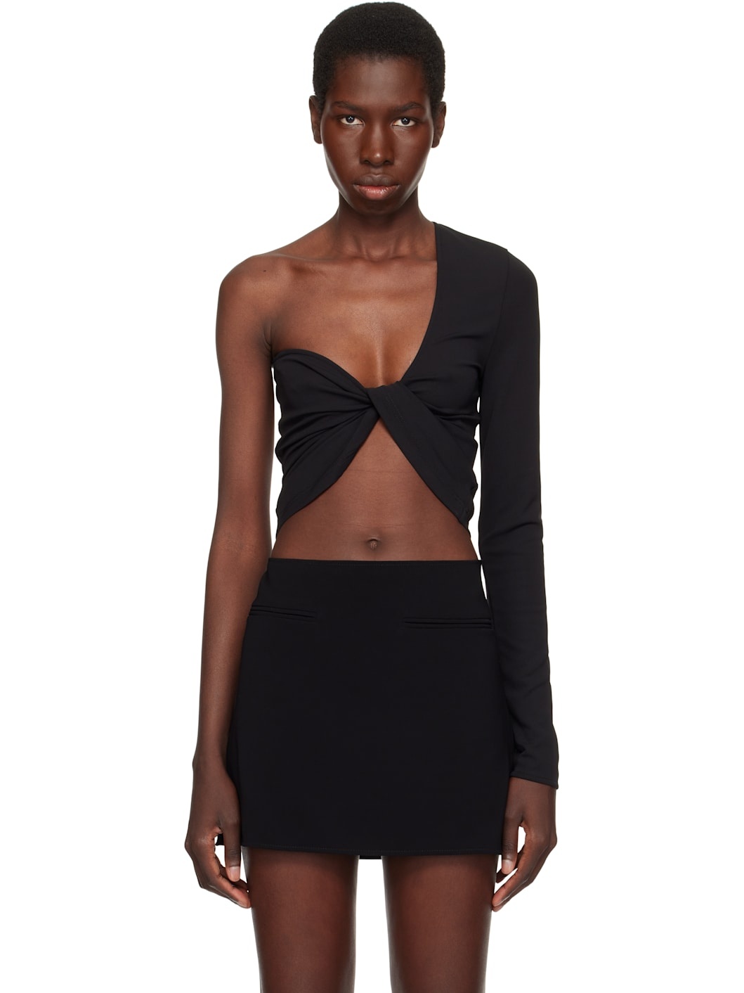 Stretch viscose jersey top. · Single-shoulder construction · Twisted detailing at chest · Cropped hem Supplier color: Black 94% viscose, 6% elastane. Made in Italy 251783F110025