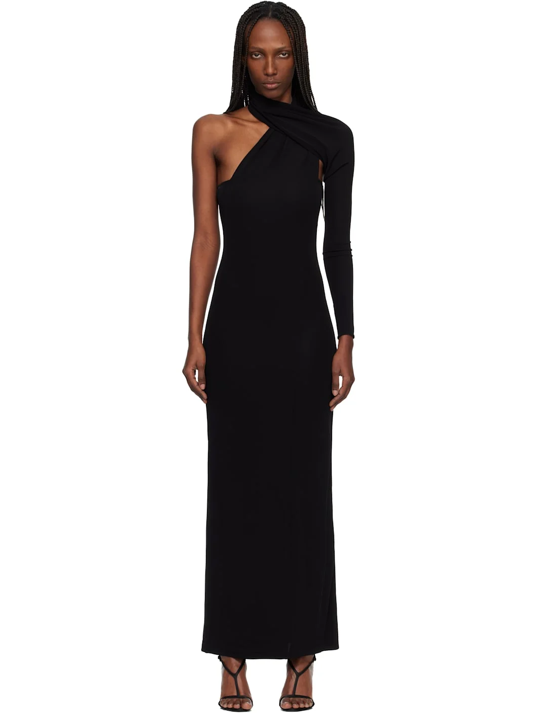 Stretch viscose crepe jersey maxi dress. · Single-shoulder wrap construction · Modified halter neck · Vent at back hem Supplier color: Black 95% viscose, 5% elastane. Made in Portugal 252783F055001