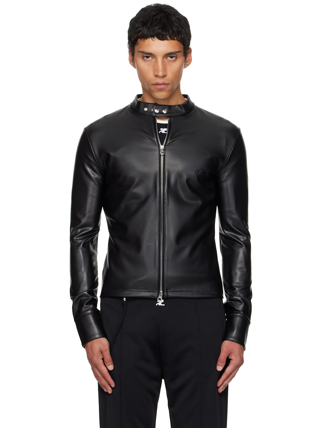 Buffed faux-leather jacket. · Press-stud fastening at band collar · Two-way zip closure · Logo embroidered at chest · Press-stud barrel cuffs Supplier color: Black 54% polyurethane, 46% polyester. Made in France 252783M213009