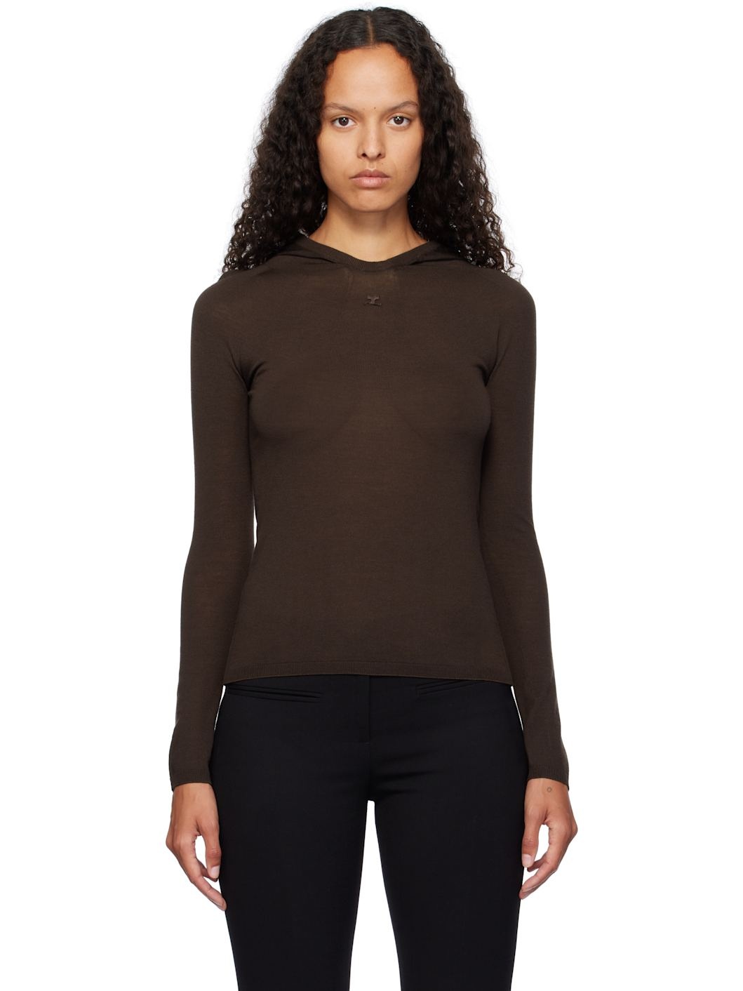 Semi-sheer knit merino wool hoodie. · Rib-knit trim at hood, hem, and cuffs · Embroidered logo patch at chest Supplier color: Chocolate 100% merino wool. Made in Italy 242783F097002